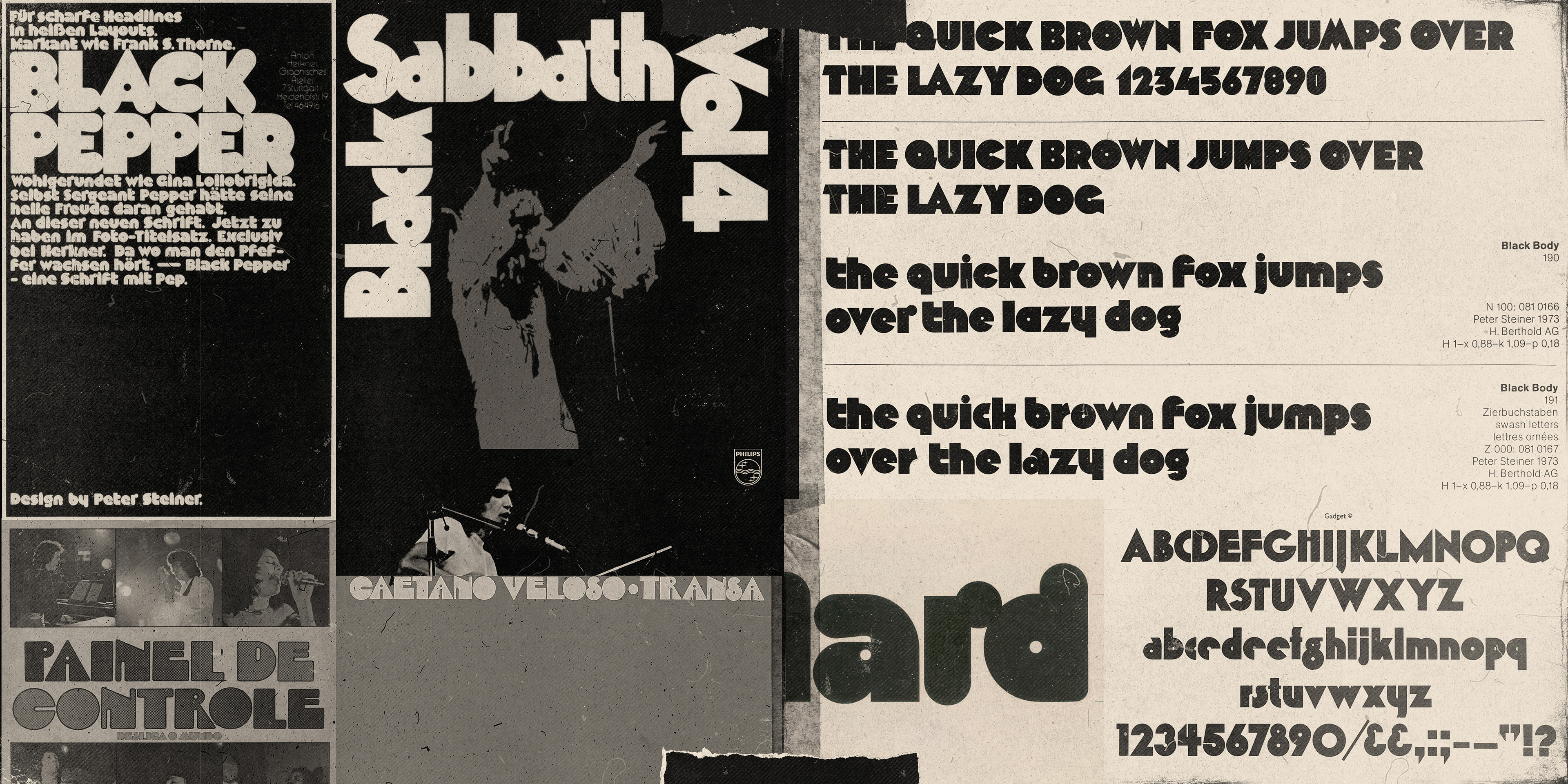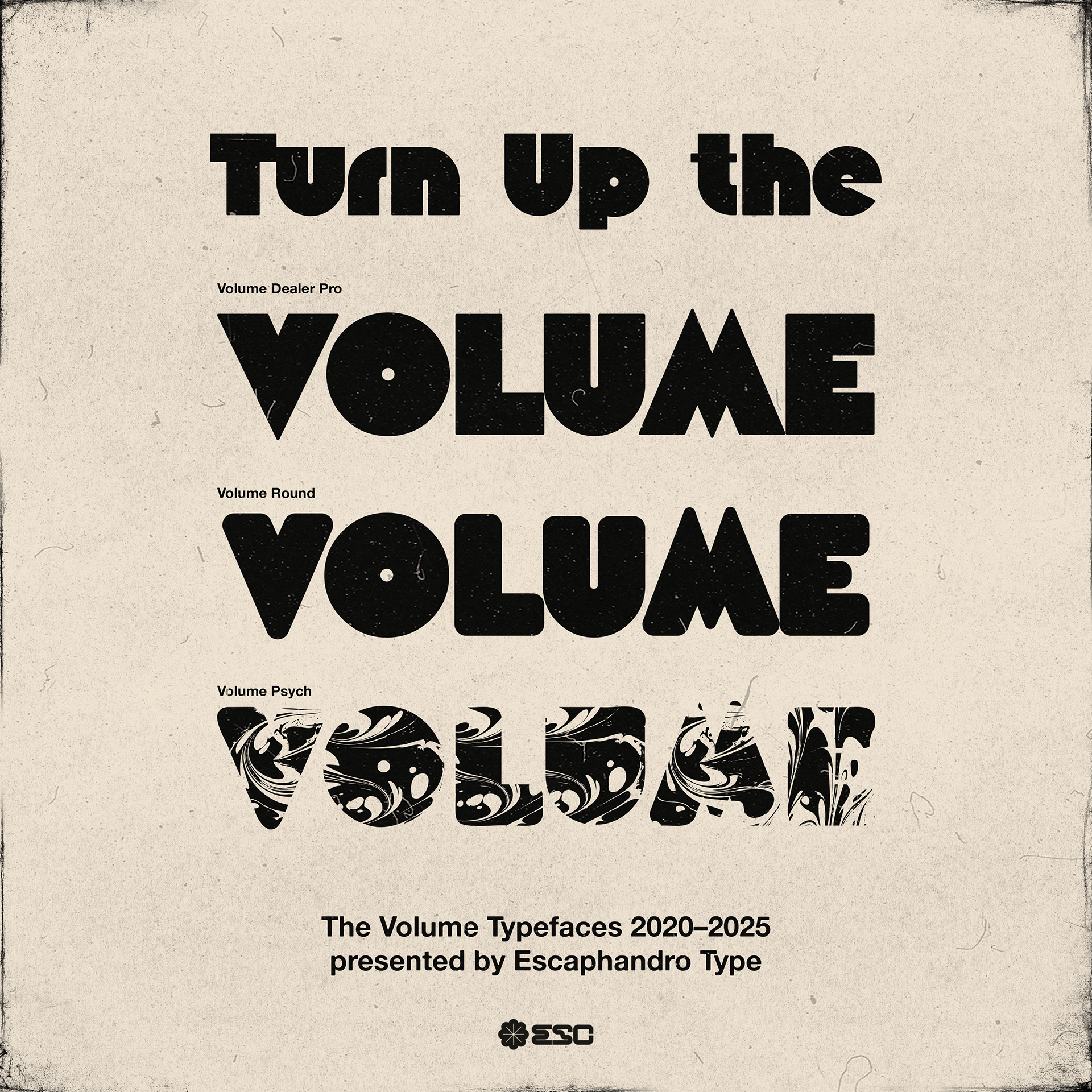 As time went by, I have expanded the Volume concept into rounded and psychedelic display versions, bringing more of the vintage inspiration as well as a more comprehensive character set. The work of Peter Steiner (Black Body and Black Pepper typefaces) and the Ginger Snap typeface were key influences in that transition to a more authentic look.
